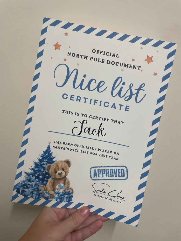 Make Christmas extra magical with our beautifully designed Nice List Certificates, straight from the North Pole! Each certificate is personalised with your child’s name and features festive illustrations, a cheerful teddy in a Santa hat, and an official “APPROVED” stamp from Santa Claus himself.